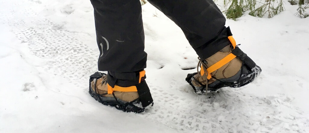 Mutta miten liukkaudelta kannattaa geokätköillessä suojautua? Markkinoilla on IceBugin nastakenkiä sekä erilaisia liukuesteitä. Otimme tällä kertaa testiryhmän kokeiltavaksi juoksemiseen suunnitellut EzyShoes X-treme -liukuesteet. Niissä ei ole varsinaisia nastoja, vaan liukueste on rakenteeltaan verkko, jota pienet metallirinkulat pitävät koossa.