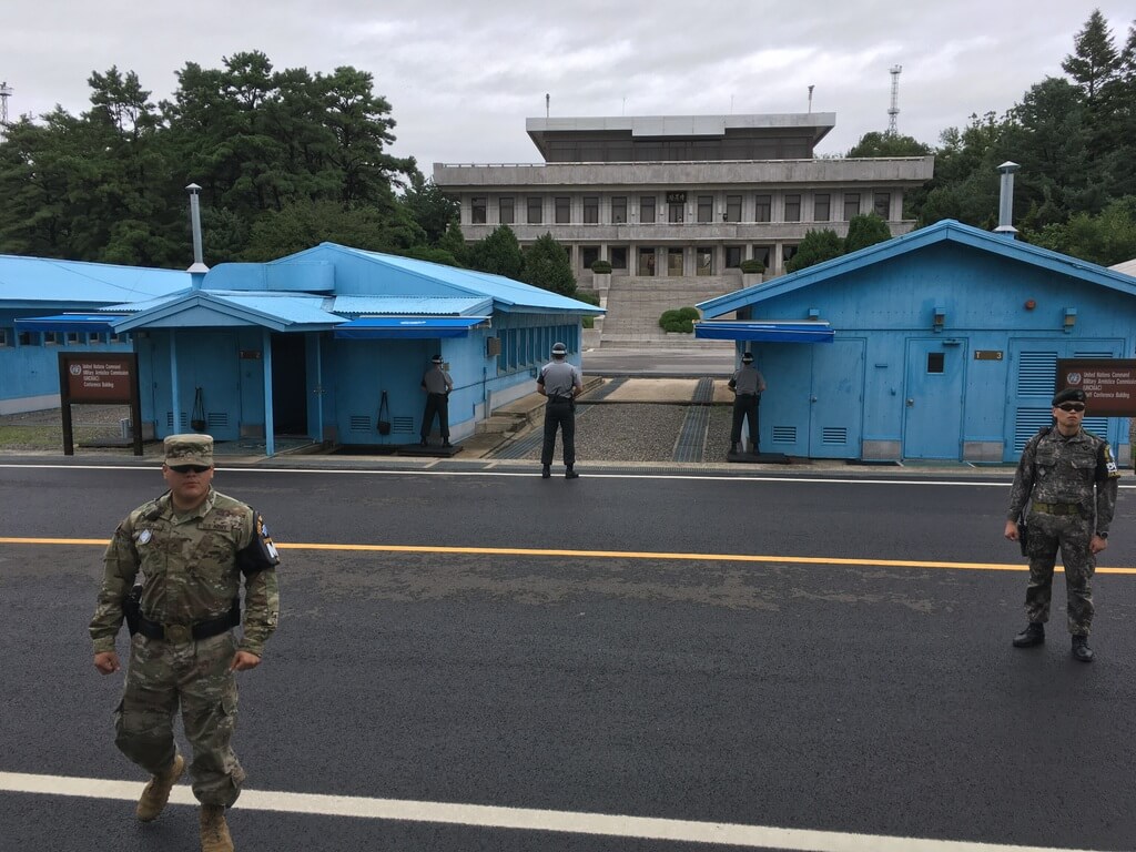 60-luvulla päättynyt Korean sota ei virallisesti koskaan päättynyt, vaan maiden välille solmittiin tulitauko. Viime aikoina tilanne on kiristynyt ainakin puheiden tasolla ja Pohjois-Korea on hermostuttanut koko maailmaa ohjuskokeillaan. Rajalla tilanne ei kuitenkaan ole muuttunut miksikään. Meitä opastanut yhdysvaltalainen sotilaspoliisi kertoo, ettei viime aikojen tapahtumat ole aiheuttaneet rajalla minkäänlaista liikehdintää kummallakaan puolen.