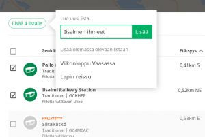 Listamuotoiselta hakusivulta voi lisätä listalle kaikki haulla löytyneet geokätköt tuhanteen asti tai valittut geokätköt. Lisäys tapahtuu vasemman reunan valintaruutujen avulla. Jos haluat lisätä kaikki geokätköt, valitse listan otsikkorivillä oleva ruutu, joka valitsee kaikki listan kätköt. Jos haluat valita yksittäisiä kätköjä klikkaa valintaruutua niiden kohdalla. Kun olet tehnyt valintoja, ilmestyy listan yläpuolelle Lisää listalle -nappi, joka kertoo myös kuinka monta geokätköä olet valinnut. Nappia klikkaamalla pääset lista-valintaan.