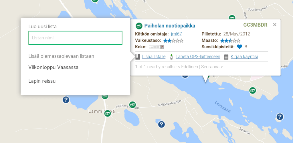 Karttahausta geokätkön saa lisättyä listalle klikkaamalla kätkön kuvaketta ja klikkaamalla sen jälkeen Lisää listalle -linkkiä, joka toimii samalla tavalla kuin kätkösivun linkki.
