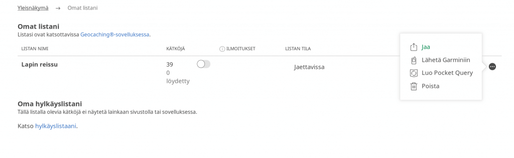 - Omat listasi Geocaching.com:ssa