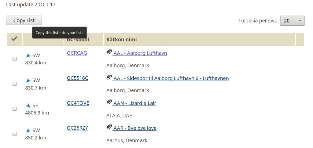 Toisen geokätköilijän listan kopiointi