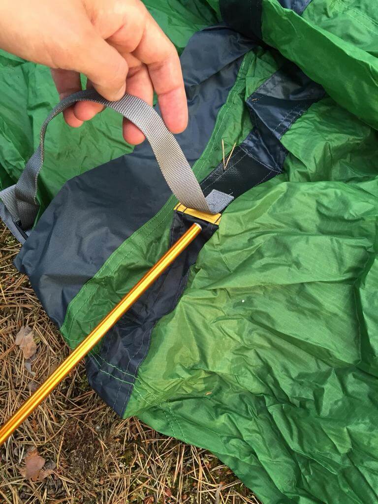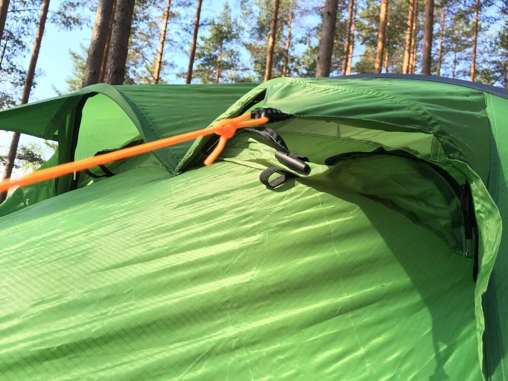 Teltassa on joka suuntaan kiinnitysnaruja, joilla sen saa tukevasti paikalleen ja tiukaksi tuulisemmallakin kelillä. Poutaisena kesäpäivänä kaikkia naruja ei tarvitse kiinnittää, sillä teltta pysyy hyvin paikallaan pelkästään telttakankaan lenksuista kiinnitettynä. Teltassa on pienet pussukat, joiden sisälle ylimääräiset narut saa sullottua. Idea on hyvä, mutta pussien pitäisi olla vähän tiukempia tai ainakin niissä pitäisi olla tiukempi kiristys suulla. Nyt narut eivät tahdo pysyä pusseissaan.