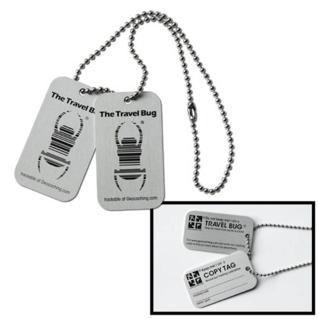 Travel Bug -laatat toimitetaan parina. Molemmissa laatoissa on sama seurantatunnus. Voit käyttää kopiolaattaa, jos alkuperäinen katoaa. Laatta on valmistettu kestävästä alumiinilevystä.