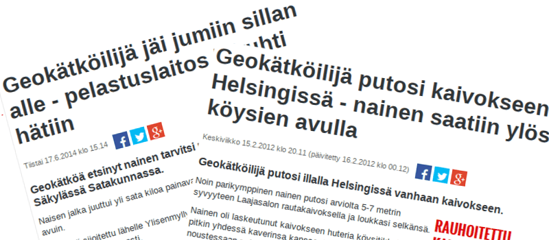 Todetaan aluksi, että geokätköily ei missään nimessä ole erityisen vaarallinen harrastus. Loukkaantuminen on kuitenkin mahdollista, kuten melkeinpä missä tahansa harrastuksessa. Järki kannattaa pitää päässä, vaikka into kätkön hakemiseen on kova. Maailmalla geokätköilijöitä on loukkaantunut ja valitettavasti jopa menehtynyt mm. putoamisonnettomuuksissa ja Suomessakin loukkaantuneita geokätköilijöitä on kannettu paareilla metsästä, nostettu kaivoksesta ja onpa joku varomaton pudonnut puustakin. Onnettomuuksia sattuu ja niihin kannattaa varautua etukäteen parhaansa mukaan ja vähentää turhia riskejä.